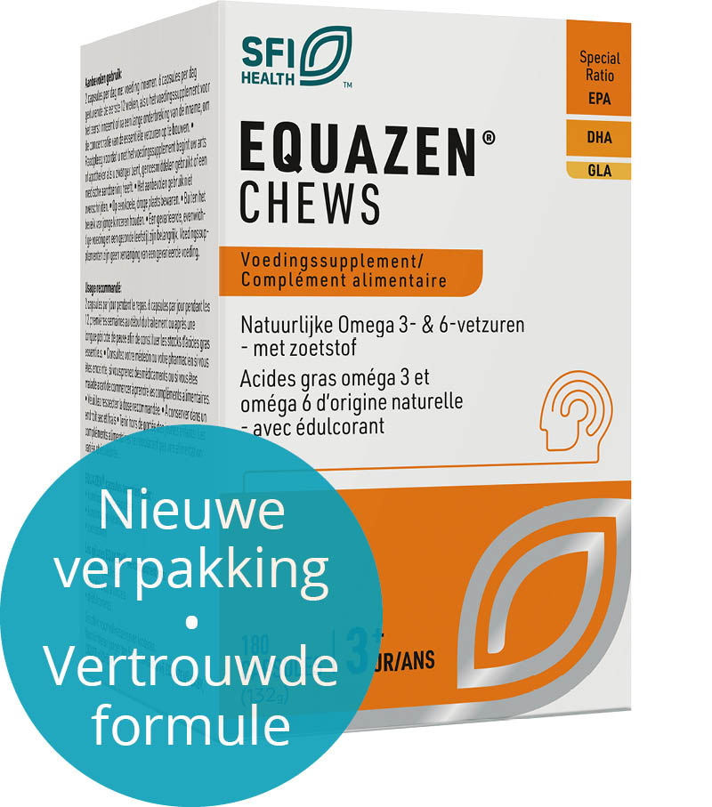 Equazen chews contiennent des acides gras essentiels, tels que les acides gras oméga 3 et 6, qui sont importants pour la santé. Ils jouent un rôle dans presque toutes les cellules du corps. Ils sont très importants, surtout pour les enfants. Comme le corps ne peut pas produire ces acides gras lui-même, ils doivent être absorbés par l'alimentation. Le poisson gras est une excellente source d'acides gras oméga 3. Le gouvernement recommande de manger du poisson au moins deux fois par semaine, dont une portion de poisson gras.