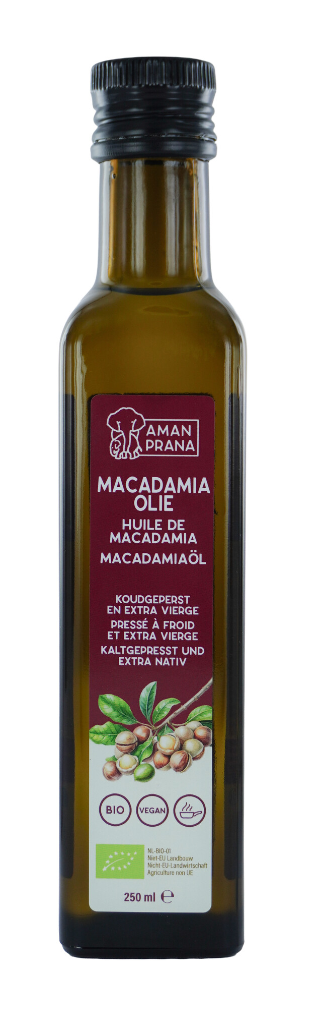 Huile de macadamia biologique Amanprana – Rare, dorée et naturellement stable.