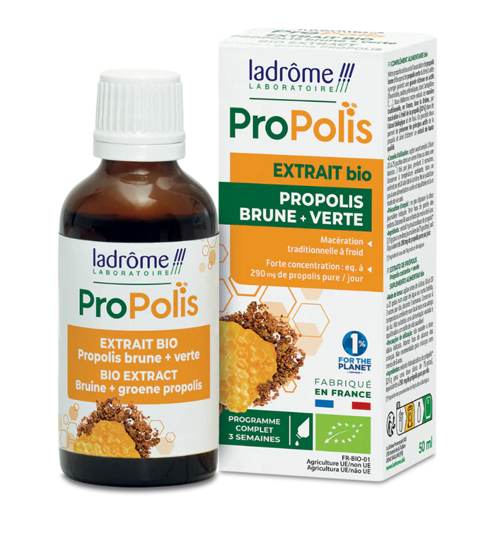 . extrait concentré de propolis brune et verte, de miel et de gelée royale