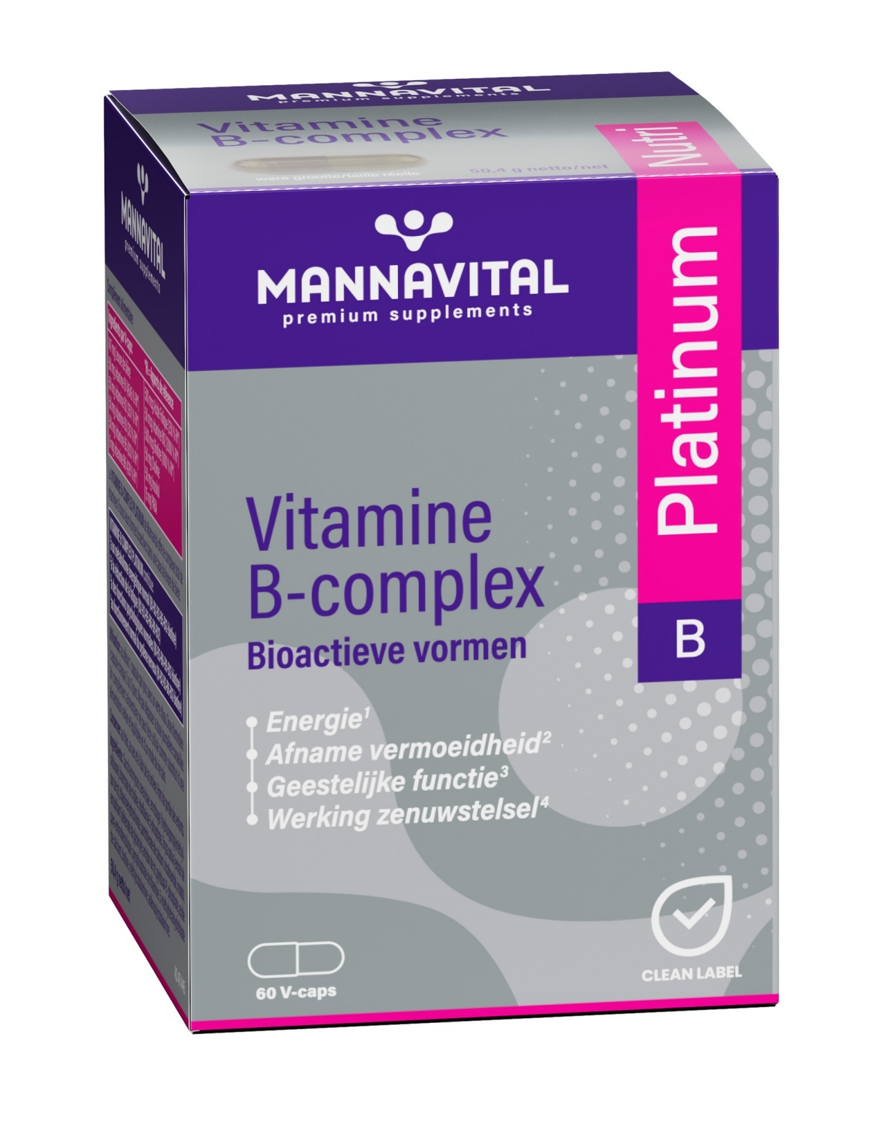 LE COMPLEXE DE VITAMINES B PLATINUM de MannaVital contribue à/au métabolisme énergétique (B1-B2-B3-B5-B12-biotine), la réduction de la fatigue et de la léthargie (B2-B3-B5-B6-B9-B12), une fonction mentale normale (B1-B3-B6-B9-B12-biotine), un fonctionnement normal du système nerveux (B1-B2-B3-B6-B12-biotine), maintien d'une peau normale et de muqueuses normales (B2- B3-biotine), maintien d'un taux d'homocystéine normal (B6-B9-B12), une production normale de globules rouges (B2-B6-B9- B12), un fonctionnement normal du système immunitaire (B6-B9- B12), un processus de division cellulaire normal (B9-B12), maintien de cheveux normaux (biotine) et un métabolisme normal des graisses (choline).
