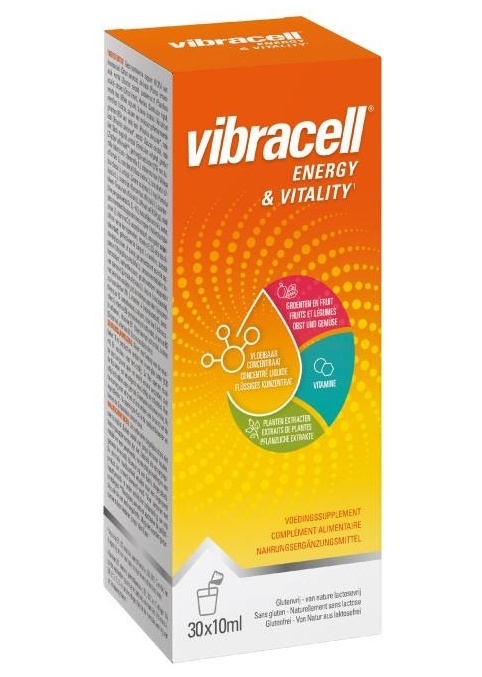 Vibracell® - Energy en Vitality (1) est un complément multivitaminé naturel à base de jus concentrés pressés à froid (61,3 %) issus de fruits, légumes et plantes sélectionnés avec soin. La plupart d'entre eux sont d'origine biologique certifiée. Des vitamines A, B1, B2, B6, B12, C, D, E, du sélénium, de la gelée royale, de la L-carnitine... y sont également ajoutés.