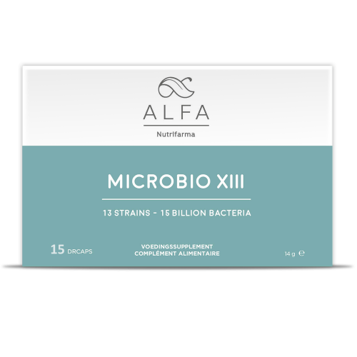 ALFA MICROBIO XIII is hoog gedoseerd met een zeer breed spectrum, bestaande uit 13 stammen en 15 miljard bacteriën per capsule.