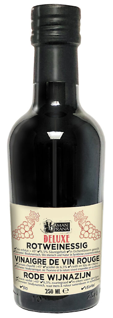 De Luxe rode wijnazijn van Amanprana wordt gemaakt van rode druiven die afkomstig zijn uit biodynamische landbouw. Dit is een vorm van biologische landbouw waarbij een holistische kijk op de natuur en het boerderijleven wordt gehanteerd.