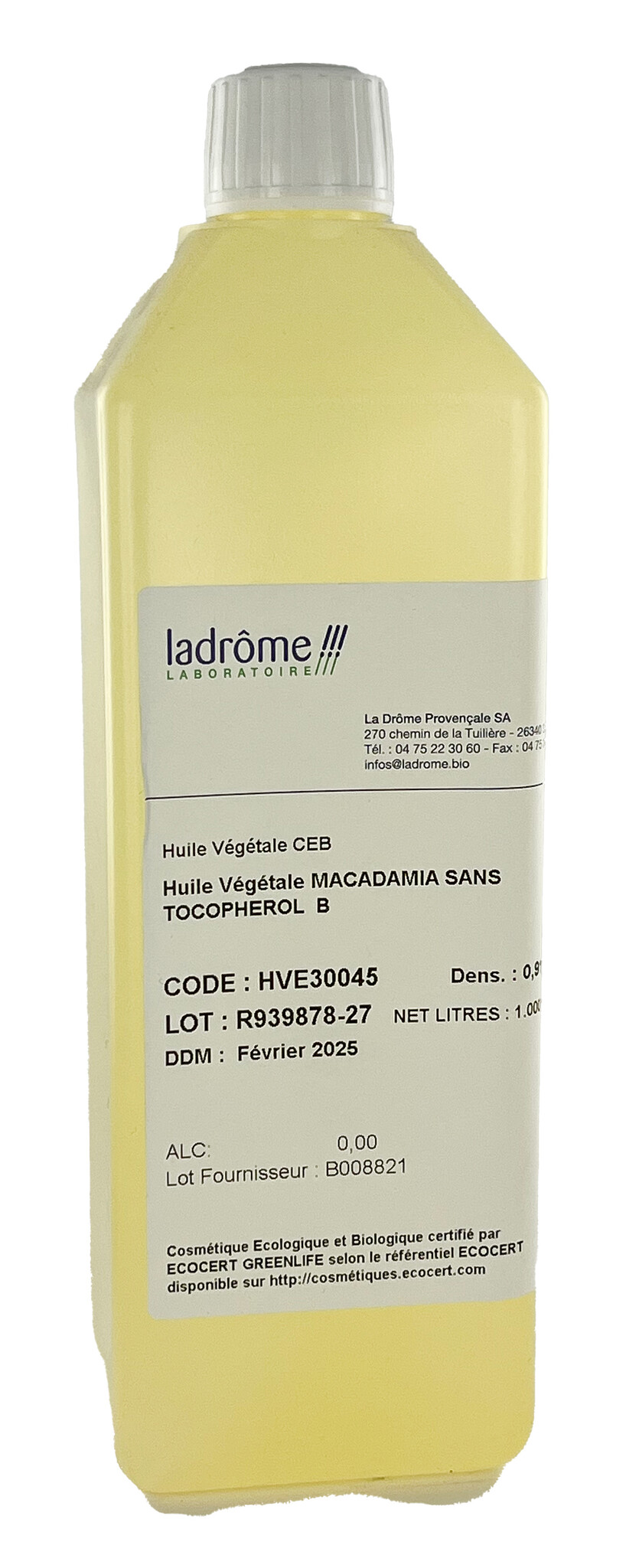 BIOLOGISCHE MACADAMIALOLIE van ladrôme is 100 % natuurlijk, uit eerste koude persing, plantaardig, zonder kleurstoffen, noch bewaarmiddelen.