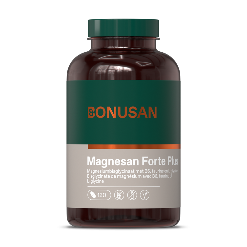 Magnesan Forte plus is al ruim 20 jaar een van de populairste Bonusan producten onder gezondheidsprofessionals. Eén tablet Magnesan Forte plus bevat 150 mg elementair magnesium. Elementair betekent dat uw lichaam deze 150 mg volledig kan gebruiken. Bovendien bevat het product uitsluitend zeer goed opneembaar bisglycinaat en is het volledig vrij van moeilijk opneembaar magnesiumoxide. De hoge kwaliteit magnesium is aangevuld met de belangrijke cofactoren vitamine B6, L-glycine en taurine. Dit product bevat geen onnodige toevoegingen zoals kleur-, geur- en smaakstoffen.