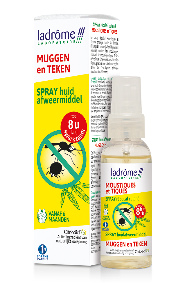 Deze muggen- en tekenspray is een huidafweermiddel tegen muggen en teken. Het actieve bestanddeel in de muggenspray is op basis van citriodol (citroeneucalyptus). Muggen en teken vinden deze geur vies en voelen zich daar niet toe aangetrokken. De muggen- en tekenwerende spray beschermt het volledige gezin tot 8 uur lang (wetenschappelijk bewezen) tegen muggen (i), inclusief de tijgermug Aedes albopictus. De spray is eveneens effectief tegen teken, dankzij een actief ingrediënt afkomstig van duurzaam geoogste citroeneucalyptus.