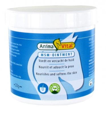 MSM-zalf van ANIMAVITAL is een breed toepasbare zalf op basis van de organische zwavelmolecule methylsulfonylmethaan (MSM), het mineraalzinken de vitaminen E (uit tarwekiemolie) en A (uit wortelolie). Regelmatig aanbrengen van de MSM-ZALF: