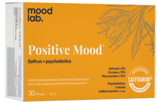 Saffraan¹ helpt het emotioneel evenwicht te bewaren, een positief humeur en een goede gemoedstoestand¹ te behouden. Moodlab Positive Mood bevat Saffranum®, een hoogwaardige saffraan met een hoog gehalte actieve stoffen en een specifieke selectie aan psychobiotica.