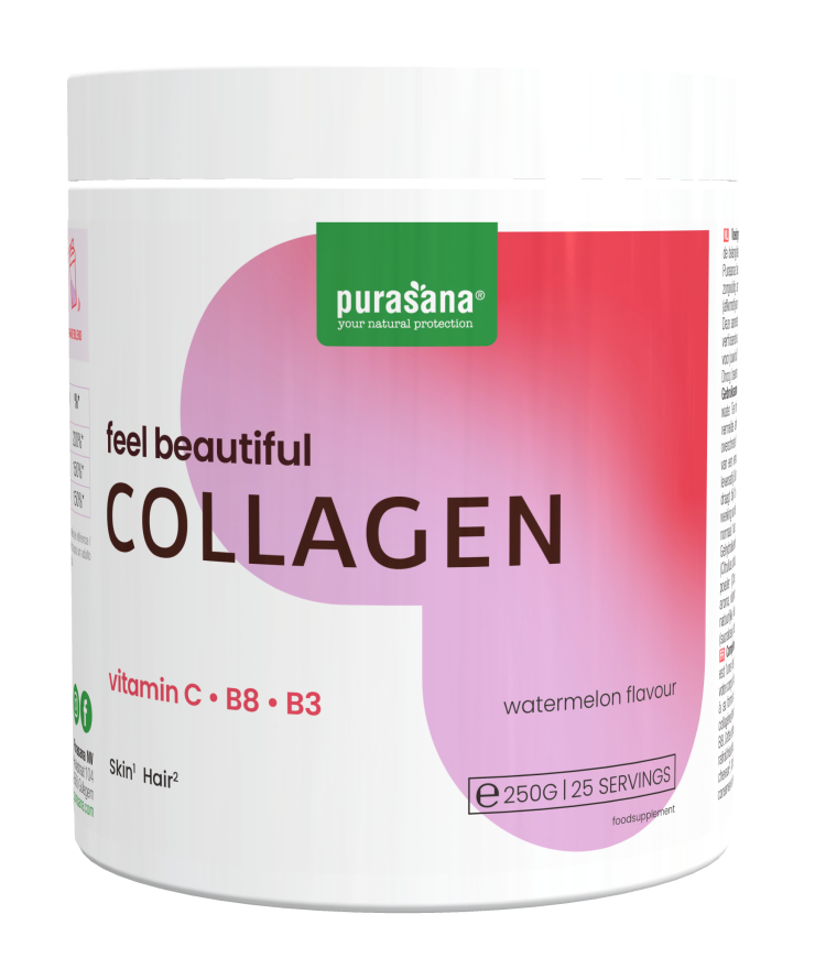 Voedingssupplement met zoetstof. Collageen is een van de belangrijkste, structurele eiwitten die uw lichaam nodig heeft. Purasana biedt u de perfecte ondersteuning door haar zorgvuldig samengestelde formule met collageen peptides, vitamine C, vitamine B3 en vitamine B8.