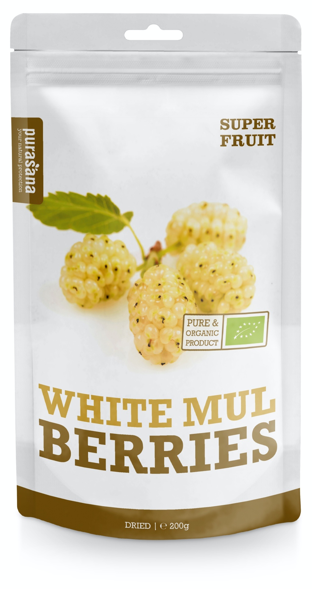 Gedroogde moerbeien van Purasana worden vaak gegeten als gezond tussendoortje. U kunt ze zo uit de hand eten of mengen met muesli, yoghurt, platte kaas, salades, smoothies, patisserie. Heerlijk als topping in uw smoothie bowl. Vrij van gluten, soja, lactose en vegetarisch.