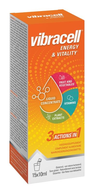 Vibracell® - Energy en Vitality (1) is een natuurlijk multivitamine supplement op basis van geconcentreerde, koudgeperste sappen (61,3 %) van met zorg geselecteerd fruit, groenten en planten. Bovendien zijn deze grotendeels van biologisch gecertificeerde oorsprong. Verder worden vitaminen A, B1, B2, B6, B12, C, D, E, selenium, koninginnenbrij, L-carnitine....toegevoegd.